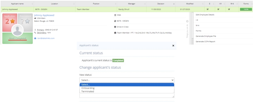 If an employee has been marked as completed, but is not in Datalink, click on the green “Hired: Completed” button and change the