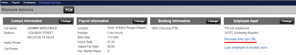 and click on the Recreate Infor sync file link under Employee Input. This should send a new file to Infor containing the employee’s