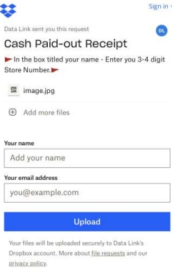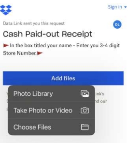 8. Select Upload - this will upload the photo to the Data Link Website for you to match it to the paid out you entered in the register system.